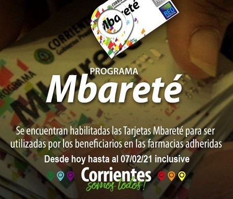 Información General | El Gobierno provincial, a través del Ministerio de Salud Pública, a cargo de Ricardo Cardozo, comunica que las tarjetas Mbareté y Mamá Mbareté se encuentran habilitadas desde el día de la fecha (15 de enero) hasta el 7 de febrero inclusive, para ser utilizadas por los beneficiarios de las mismas.