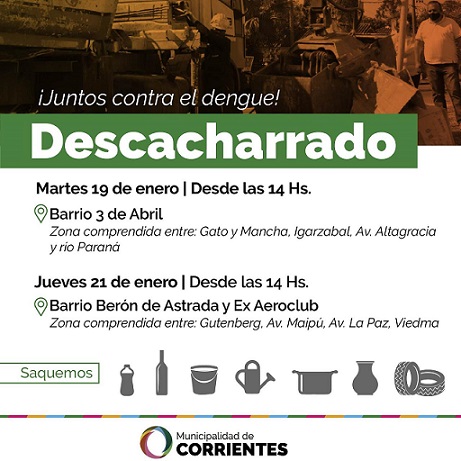 Información General | Las cuadrillas de la Municipalidad estarán recorriendo este martes, a partir de las 14, el barrio 3 de Abril para retirar los elementos que puedan acumular agua y sean posibles focos para la reproducción del mosquito vector del dengue. Entre tanto, el jueves las acciones se desarrollarán en los barrios Berón de Astrada y Ex Aeroclub.