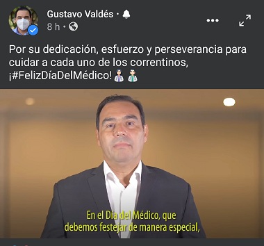 Información General | El gobernador Gustavo Valdés por medio de su cuenta de Facebook, expresó sus saludos por el día del médico a todos los trabajadores de la salud que se desempeñan en la provincia.