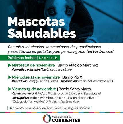 Información General | Como todas las semanas, la Municipalidad de Corrientes recorre los diferentes barrios de la ciudad con el operativo de Mascotas Saludables. La iniciativa que busca concientizar en los vecinos hacia una tenencia responsable de los animales domésticos brindará a quienes se acerquen a los diferentes puntos desde las 8 y hasta los 12 servicios veterinarios gratuitos de control de salud, desparasitaciones, colocación de vacunas antirrábicas y esterilizaciones.