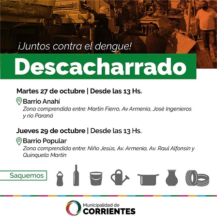 Información General | El municipio de Corrientes continúa con los operativos de descacharrado en diferentes barrios de la ciudad. Esta semana los camiones recolectores recorrerán la zona del Anahí, el martes y el Popular el jueves. Desde las 13 los vecinos podrán sacar todos los elementos en desuso que puedan contener agua para evitar se reproduzca el mosquito transmisor de dengue.