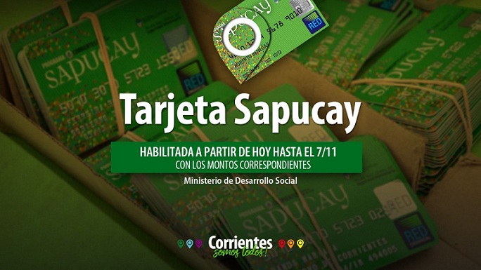 Información General | El Ministerio de Desarrollo Social del Gobierno de Corrientes, a cargo de Adán Gaya, informa a los beneficiarios del Programa, que las Tarjetas Sapucay se encuentran habilitadas desde hoy martes 20 de octubre, hasta el 7 de noviembre, con los montos correspondientes.