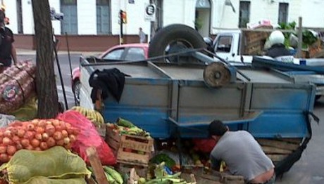 Policiales | En las primeras horas de la mañana de hoy miércoles un camión Ford F-100 perdió su carga cuando el trailer que llevaba volcó en la intersección de Avenida 3 de Abril, casi Santa Fe. Por ésta razón el tránsito estuvo restringido por varios minutos debido a las frutas y verduras esparcidas en la cinta asfáltica.