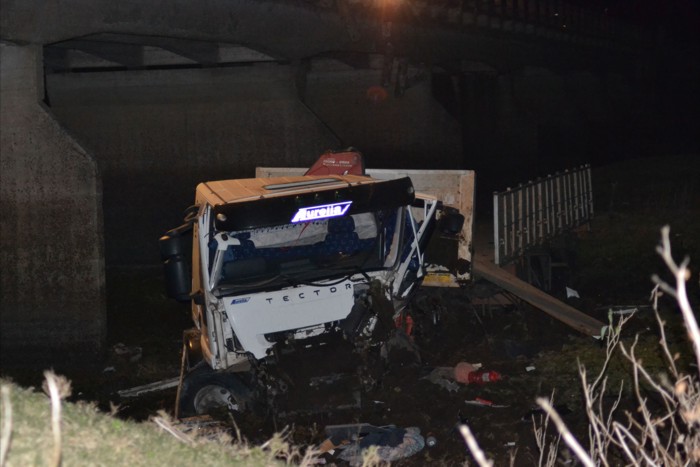 Policiales | En el inicio de la jurisdicción de Saladas por ruta Nacional 118, sobre el puente Paso Naranjo del río Santa Lucia, un camión con semirremolque chocó contra las barandas de ambos lados del puente y se precipitó al vacío para terminar su carrera a la vera de dicho río. El conductor afortunadamente solo revistió lesiones leves.