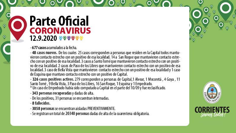 Información General | El informe epidemiológico de la fecha da cuenta de 48 nuevos casos de Coronavirus en la Provincia, de los cuales 25 corresponden a Capital, 14 a San Roque, 3 a Santo Tome, 2 de Paso de los Libres, 3 a Bella Visa, 1 de Esquina. De esta manera se acumulan a la fecha 677 casos positivos, de los cuales se recuperaron 343 personas que fueron dadas de alta.