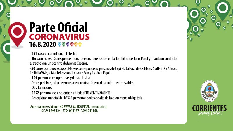 Información General | El informe epidemiológico de la Provincia, da cuenta que en las últimas 24 horas no se produjeron nuevos contagios de Coronavirus, de esta manera el acumulado en ese sentido se mantiene en 251, de los cuales se han recuperado 202 personas que fueron dadas de alta.
