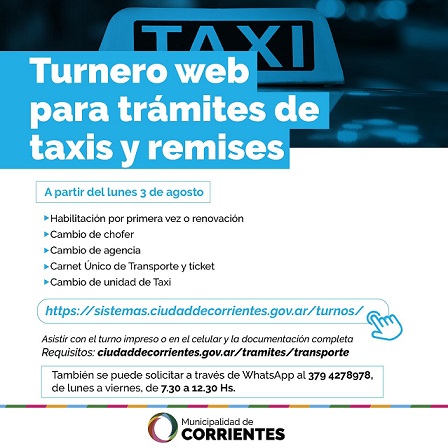 Información General | Estará disponible a partir del lunes 3 de agosto a través de la página municipal https://sistemas.ciudaddecorrientes.gov.ar/turnos/ y será para gestionar trámites diversos, como habilitación por primera vez o renovación. Se van a dar más de 100 turnos por semana para atención en las oficinas de la Subsecretaría de Transporte.