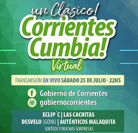 Información General | Corrientes Cumbia Virtual, el clásico de todos los sábados correntinos, presentará este 25 de julio la actuación de los grupos Eclip’c, Las Cachitas, Auténticos Malaquita y Desvelo, proveniente de Goya. La cita será a partir de las 22, en vivo a través de las cuentas en Facebook, Gobierno de Corrientes; y en Instagram, gobiernocorrientes.
