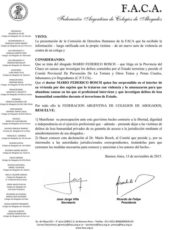 Política | El presidente del Colegio Público de Abogados de la Primera Circunscripción Judicial de la Provincia de Corrientes, doctor Ricardo Manuel Villar, confirmó que la entidad adhiere a la manifestación de preocupación que expuso la Federación Argentina de Colegios de Abogados (F.A.C.A.), ante una agresión violenta en perjuicio de abogado de Chaco, doctor Mario Bosch.