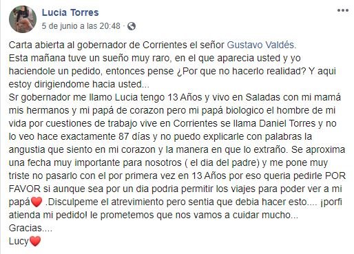 Información General | A través de una emotiva publicación por Facebook una niña de 13 años emocionó al Gobernador. En la conferencia de prensa de hoy anunció que la leyó y le permitirán viajar.