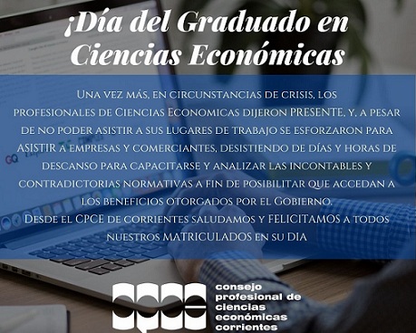 Información General | Hoy se celebra el día del Graduado en Ciencias Económicas. El CPCE Corrientes saluda a todos los matriculados en su día. Nuestro reconocimiento a quienes, en tiempos de Pandemia, adecuaron su trabajo y se capacitaron para asistir a Empresas y comerciantes.