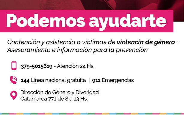 Información General | Un equipo interdisciplinario municipal especializado en perspectiva de género se encuentra disponible las 24 horas para brindar asesoramiento, contención y atender consultas a través de la línea telefónica 379-5015619. También se recuerda que las mujeres pueden recurrir a la línea nacional gratuita, marcando el 144, o bien al 911.