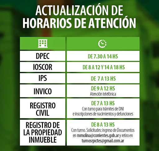 Información General | En el marco de la habilitación de algunas actividades por parte del Gobierno provincial en esta etapa 5 de la pandemia por el Coronavirus, los organismos del sector público se encuentran trabajando con nuevos horarios de atención.