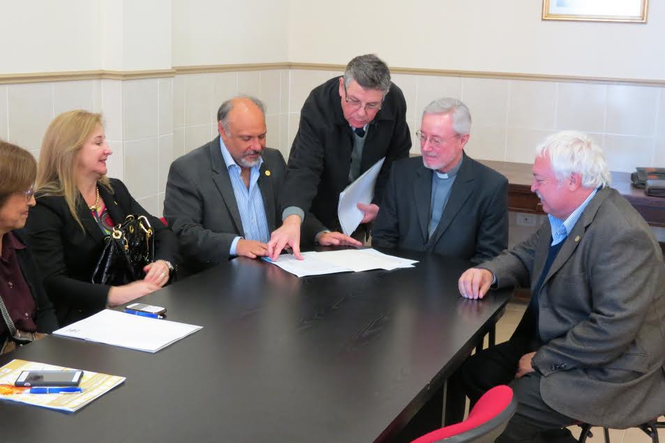Política | El arzobispo Andrés Stanovnik en su carácter de titular de “Cáritas” y el presidente del Banco de Corrientes, Alejandro Abraham, acompañado del vicepresidente Roberto Demonte y la directora Rosa Pasetto, suscribieron poco antes del mediodía de este miércoles, un convenio a través del que la mencionada institución filantrópica, centraliza sus recaudaciones en todo el territorio provincial, en el organismo bancario.