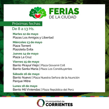 Información General | Además de los lugares habituales, los productores locales se presentarán los próximos días en paseos públicos de los barrios Nuevo, Santa María, Pirayuí, Mil Viviendas, y también estarán en la plaza Evita y el parque Mitre. De 8 a 13, los puesteros pondrán a disposición de los vecinos mercadería de primera calidad, a precios económicos.