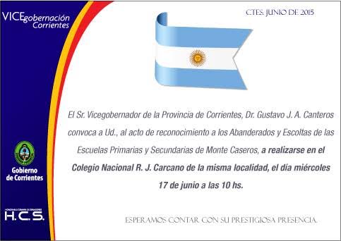 Política | Los abanderados y escoltas de las escuelas primarias y secundarias de Monte Caseros serán reconocidos por el Vicegobernador de la Provincia de Corrientes, Dr. Gustavo Canteros éste miércoles 17 de junio a partir de las 10 hs en las instalaciones del Colegio Nacional R. J. Carcano.