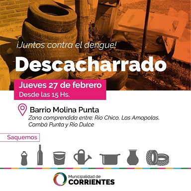 Información General | El operativo ambiental se cumplirá este jueves en la zona comprendida entre Río Chico, las amapolas y Camba Punta y Río Dulce. Los vecinos deberán depositar a partir de las 14.30 en las esquinas del sector cualquier tipo de elemento en desuso que pueda ser reservorio de larvas del vector que transmite el dengue y otras enfermedades vectoriales.