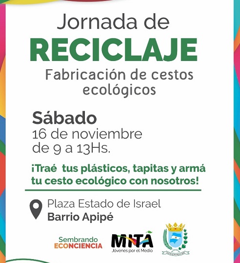 Información General | En el marco del programa “Mitá: jóvenes por el medio”, alumnos de 5° año del Colegio Secundario del barrio Apipé plantaran árboles autóctonos y armaran cestos con material reciclado donado. La jornada se llevará adelante el próximo 16 de noviembre de 9 a 13 en la plaza Estado de Israel.