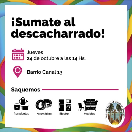 Información General | Los vecinos del sector podrán sacar desde las 13.30 a la vía pública, todos aquellos elementos que ya no sean de utilidad en sus viviendas, los que serán recolectados por la Municipalidad. Promotores ambientales e inspectores de higiene recorrerán previamente las calles para concientizar a la comunidad de la importancia de la actividad. El operativo, programado originalmente para el jueves 17, debió suspenderse a raíz de las malas condiciones climáticas.