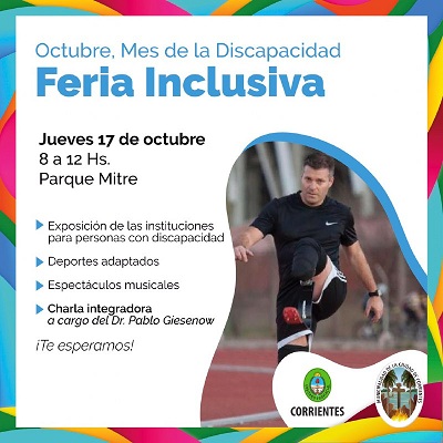 Información General | El próximo jueves 17 de octubre a partir de las 8 en el Parque Mitre se desarrollará una feria inclusiva con disertaciones, exposiciones, deportes adaptados y maratones. Participarán distintas instituciones y el cordobés Pablo Giesenow contará su trascendental historia de vida. No se suspenderá en caso de mal tiempo.