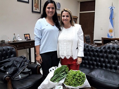 Información General | La ministra de Educación, Susana Benítez esta mañana recibió en su despacho a la docente Ing. Agro. Mariel Vergara perteneciente a la dirección de Educación Permanente de Jóvenes y Adultos correspondiente al Plan FinEs taller de huerta. En la oportunidad, la docente hizo entrega a la titular de la cartera educativa de un presente enviado por los alumnos del “Complejo Filadelfia”, verduras cosechadas en el mencionado taller.