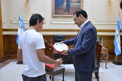 Información General | Esta mañana el gobernador, Gustavo Valdés, recibió en su despacho al tenista correntino Agustín Velotti, quien le llevó su último trofeo obtenido en el M 25 de Hong Kong. El deportista de 27 años se encuentra en el puesto 428 del ranking mundial ATP.