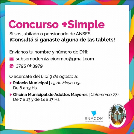 Información General | Se trata de un primer corte de 4100 equipos. Personal perteneciente a la Subsecretaría de Modernización y de Adultos Mayores comenzaron a informar a los beneficiarios para coordinar el lugar, día y horario de entrega. Además, quienes deseen obtener mayores detalles o saber si fueron los ganadores están disponibles diversas vías de comunicación.
