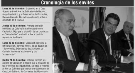 Política | El retruque entre Colombi y Capitanich caldeó los ánimos políticos de fin de año. La situación financiera de las provincias, en el centro del debate. Para mañana está prevista la firma por la refinanciación de las deudas de 18 distritos. “La situación es preocupante y requiere de urgentes medidas”, fue la tajante afirmación de Ricardo Colombi.