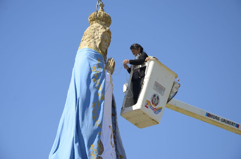 Información General | A partir de hoy, la Virgen de la rotonda de Itatí lucirá un manto nuevo. Liliana Paniagua renovó su promesa de vestir a la Virgen, y junto a su familia dedicaron varios meses para la confección del atuendo que todos los que transiten por la zona podrán ver. La Municipalidad dispuso de grúas y escaleras especiales para colocar el manto a la imagen.
