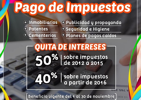 Información General | El nuevo régimen dado a conocer este martes regirá del 1 al 30 de noviembre, abarca a todas las contribuciones municipales y comprenderá una reducción del 50% en los intereses resarcitorios de las obligaciones vencidas entre 2012 y 2015, y del 40% para las de 2016 en adelante.