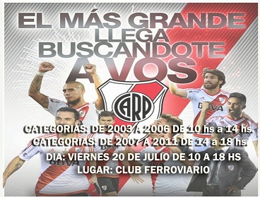 Información General | La Secretaría de Deportes de la Provincia, a cargo de Jorge Terrile, informó que el próximo viernes 20 de julio de 10 a 18 horas, el Club Atlético River Plate realizará una “Prueba Regional de Juveniles” para la búsqueda de talentos.